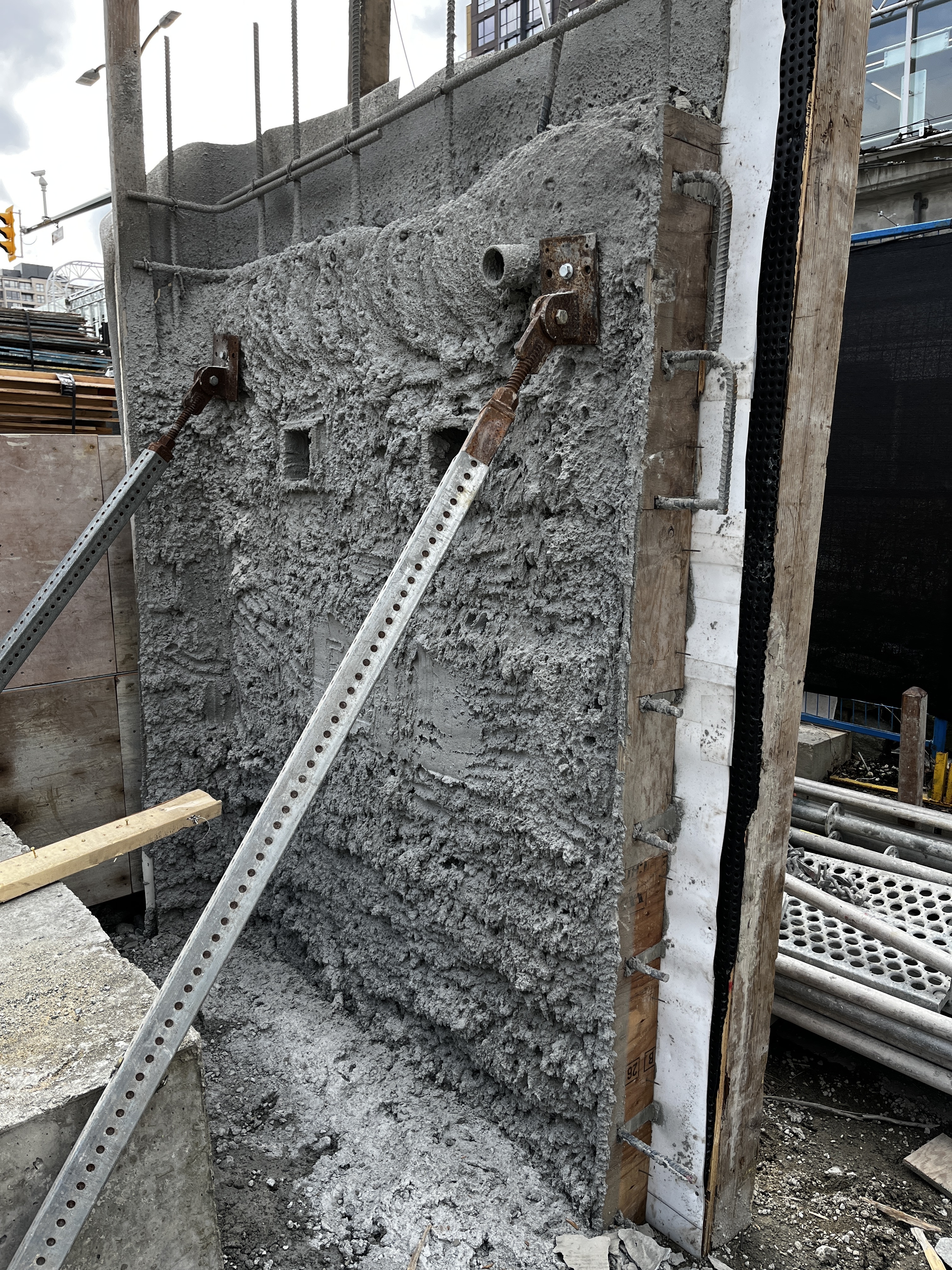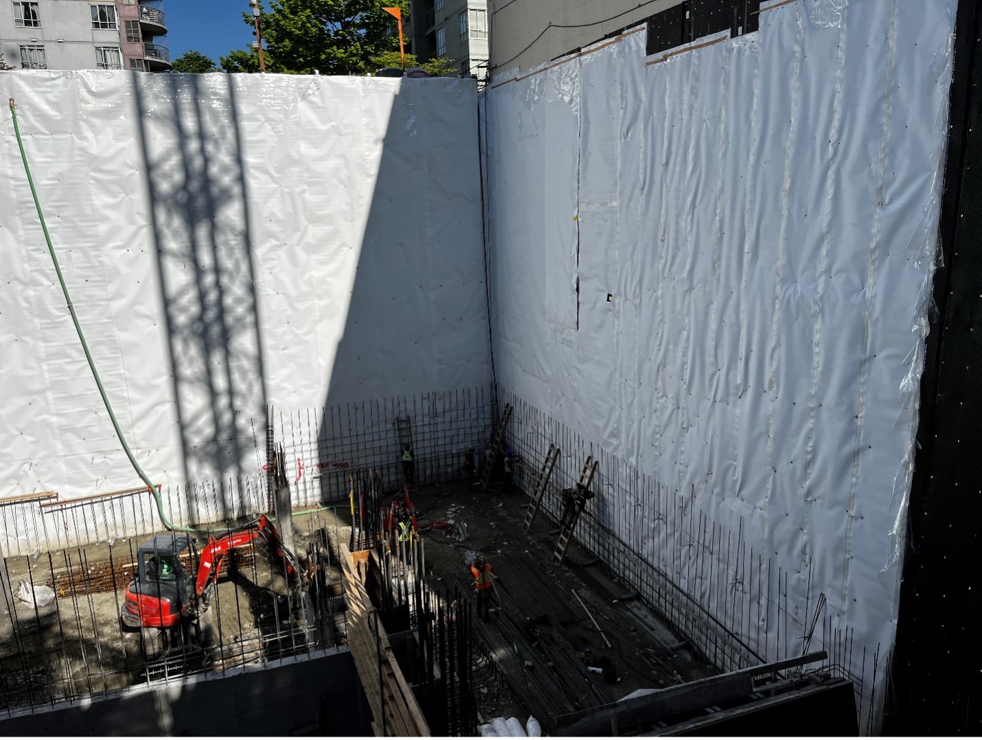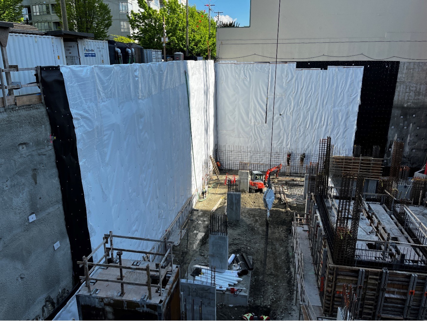 The EPRO team was also asked to build a blindside mockup for RDH Vancouver who were new to the system. To help RDH familiarize themselves with PreTak, EPRO worked closely with Kanin and built a 10' x 15' mockup for the rebar cage and shotcrete. After a brief concrete cure, RDH performed numerous pull tests on the back side, and moved forward with PreTak on this project.